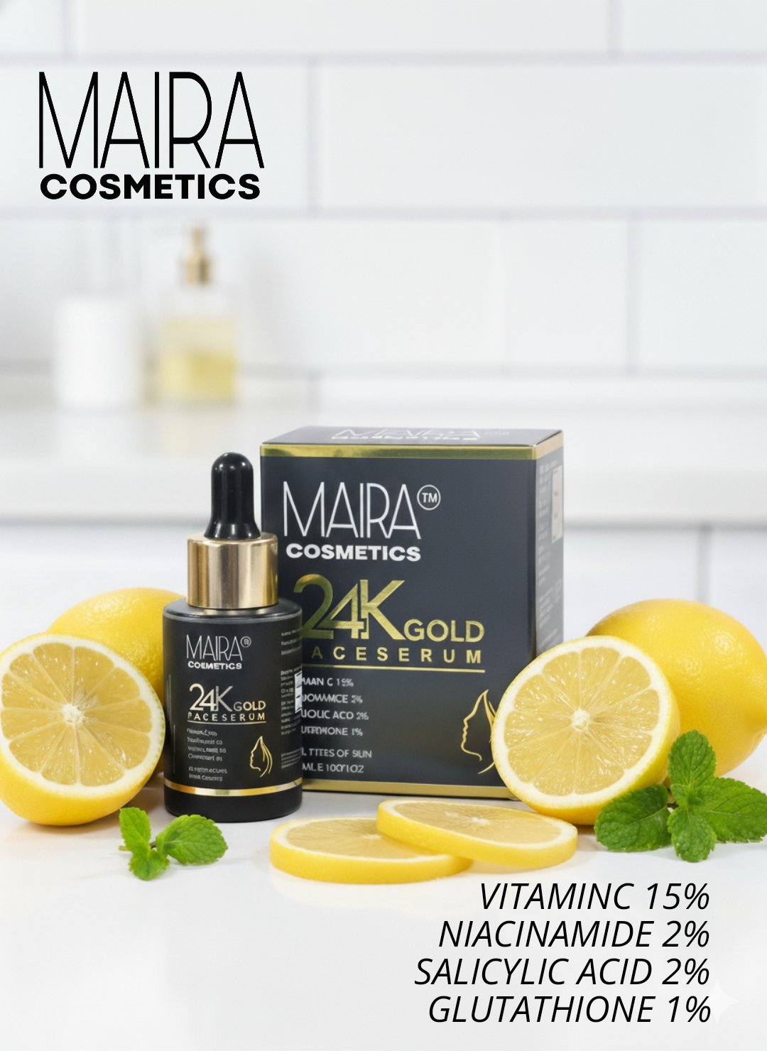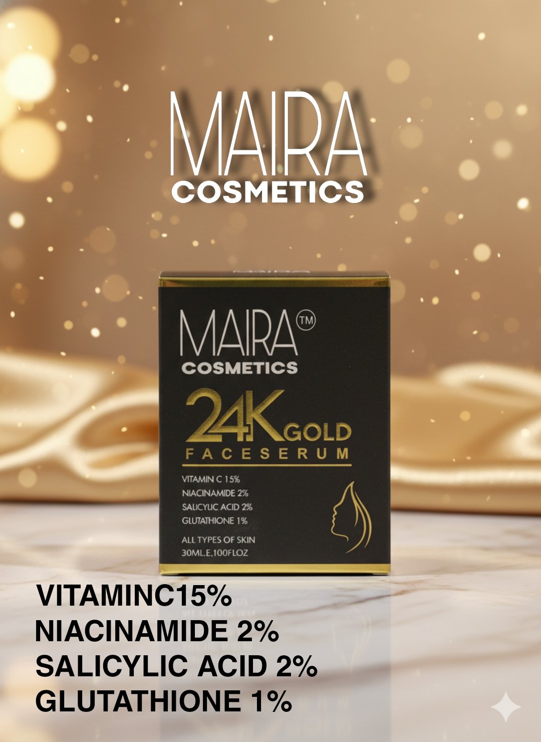Bring back your skinโs natural radiance with MAIRA COSMETICS 24K Gold Face Serum โ a powerful blend of science and luxury. This advanced brightening serum is carefully formulated with Vitamin C 15%, Niacinamide 2%, Salicylic Acid 2%, Kojic Acid, Alpha Arbutin, and Glutathione to target multiple skin concerns at once.